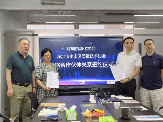 6月6日下午,深圳自动化学会与深圳市南山区质量技术协会签署《建立战略合作伙伴关系协议》,开启自动化技术与质量技术融合发展新篇章。深圳自动化学会常务副会长李云峰、秘书长贺艳萍,深圳市南山区质量技术协会会长李北、秘书长鲍贤勇、专务陈杰、高级标准化工程师郭迪迪等双方代表出席签约仪式。