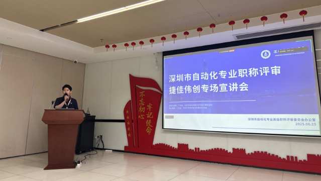 6月25日下午,为进一步推动自动化专业职称评审工作,提供更好更优质的人才服务,切实帮助用人单位和专技人才解决职称申报相关疑难困惑。深圳自动化学会走进深圳市捷佳伟创新能源装备股份有限公司开展了深圳市自动化专业职称评审公益性宣讲会,更贴心为企业外出公干职员同步开通了线上宣讲会。此次会议由深圳自动化学会业务部部长江嘉楷主讲。