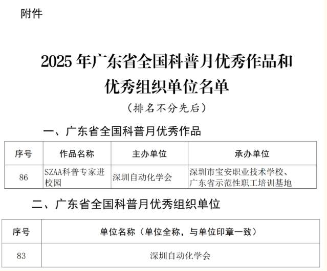捷报传来,喜讯盈门!近日,广东省科学技术协会正式印发《关于公布2025年广东省全国科普月优秀作品和优秀组织单位的通知》(粤科协〔2026〕1号),深圳自动化学会凭借扎实的科普实践与高效的组织统筹能力,斩获双项殊荣——主办的“SZAA科普专家进校园”活动获评“2025年广东省全国科普月优秀科普活动案例”,学会获评“2025年广东省全国科普月优秀组织单位”,以硬核实绩彰显了学会在科普赋能产业、服务教育中的标杆作用! 10