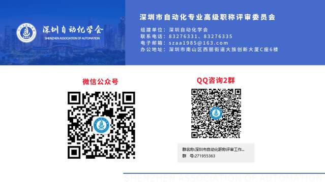 对于申报规模较大、职称申报咨询需求较多、申报材料问题集中的企业、园区,可以联系学会预约上门宣讲、面对面受理等服务,联系方式:0755-83276331、83276335。自动化专业QQ群(2群:271955363,已加入1群的无需重复加入2群)接受线上答疑和辅导。 SZAA - 深圳自动化学会